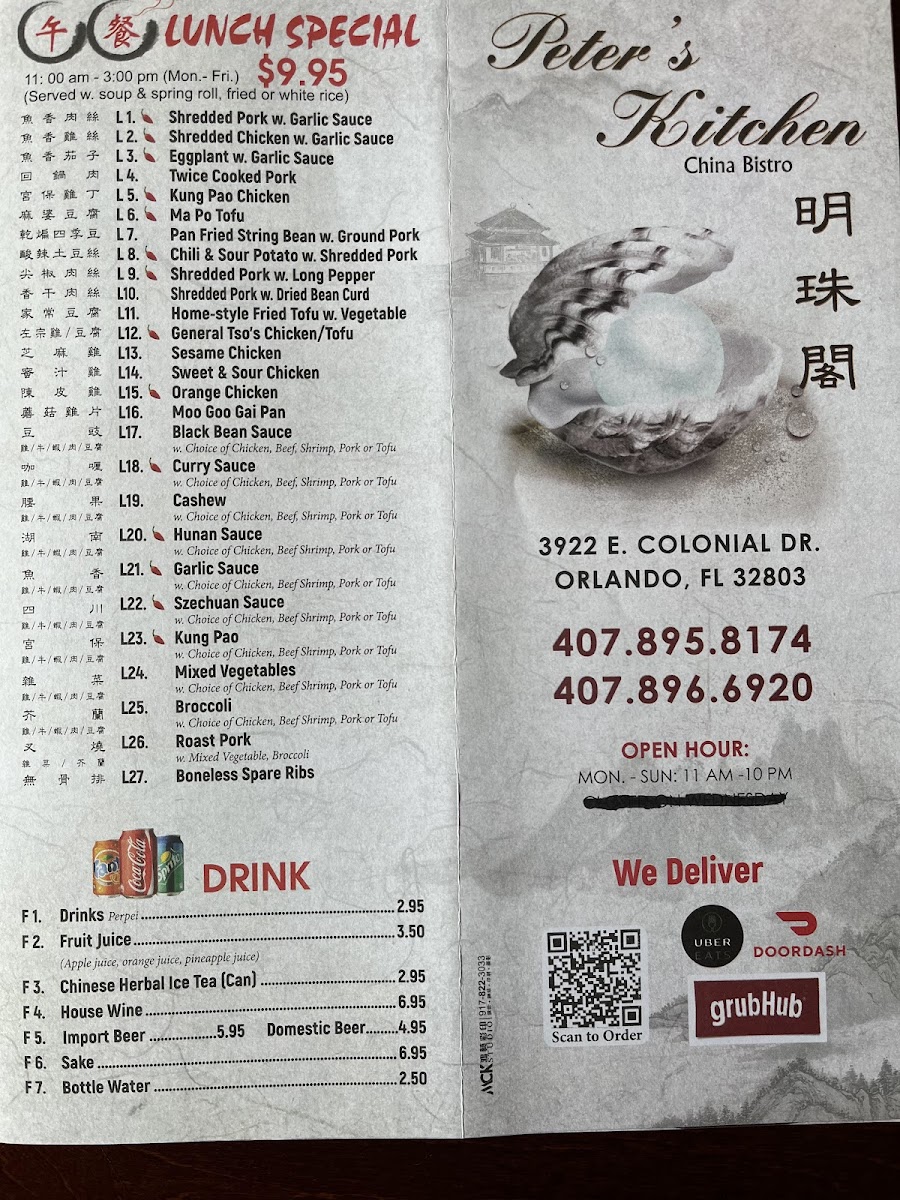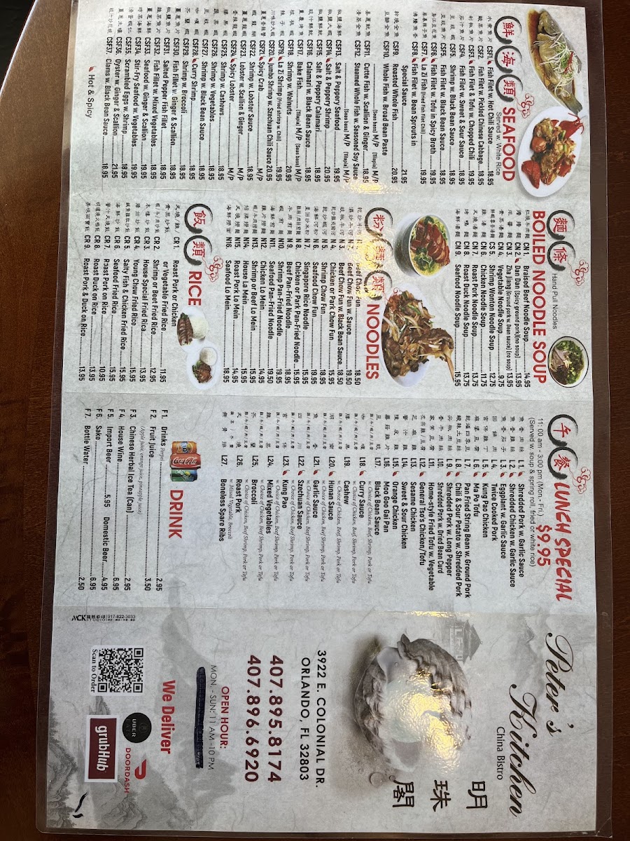 If you're craving authentic Chinese cuisine in Orlando, the Peter's Kitchen China Bistro Menu is sure to hit the spot. Located at 3914 E Colonial Dr, this cozy spot offers a variety of mouth-watering dishes that bring the rich flavors of China right to your table. From sizzling stir-fries to delicate dumplings, each dish is crafted with fresh ingredients and traditional spices. Whether you’re a fan of bold, spicy dishes or prefer something light and savory, there’s something for everyone. With an inviting atmosphere and friendly service, it’s the perfect place to enjoy a meal with family and friends.